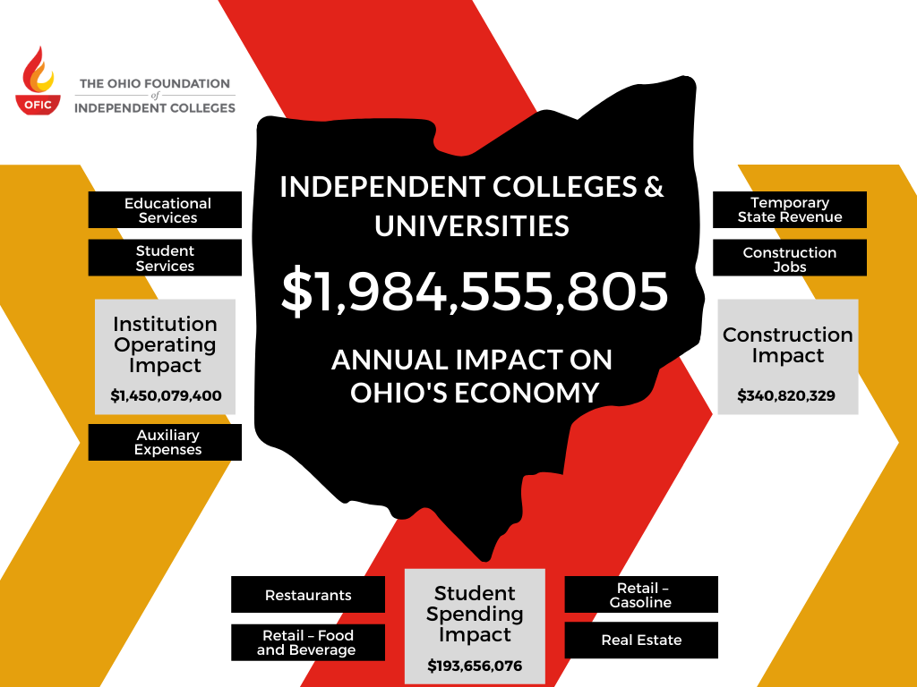 Commissioned by OFIC and conducted by G. Jason Jolley, Ph.D., and Eric Belleville, M.A., from Ohio University’s Voinovich School of Leadership and Public Affairs, the economic impact study was designed to assess the economic impact of OFIC’s 33 member institutions on the state of Ohio. Institution operations, construction, and students spending for OFIC member institutions represented $2 billion in annual economic impact. OFIC successfully competed for a capacity-building grant from the Council of Independent Colleges (CIC), located in Washington, DC, which funded the study.